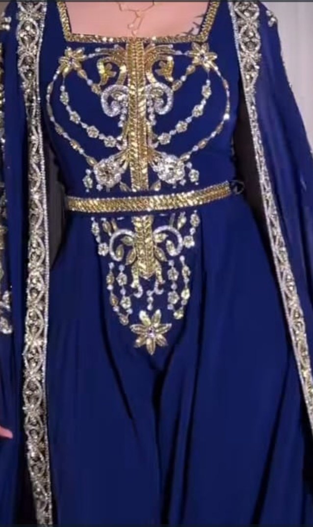 Bu uzun, vücuda oturan mavi abiye elbise parlak işlemeler ve V yakalı, askılı detaylarla süslenmiştir. Düğünler için uygundur.