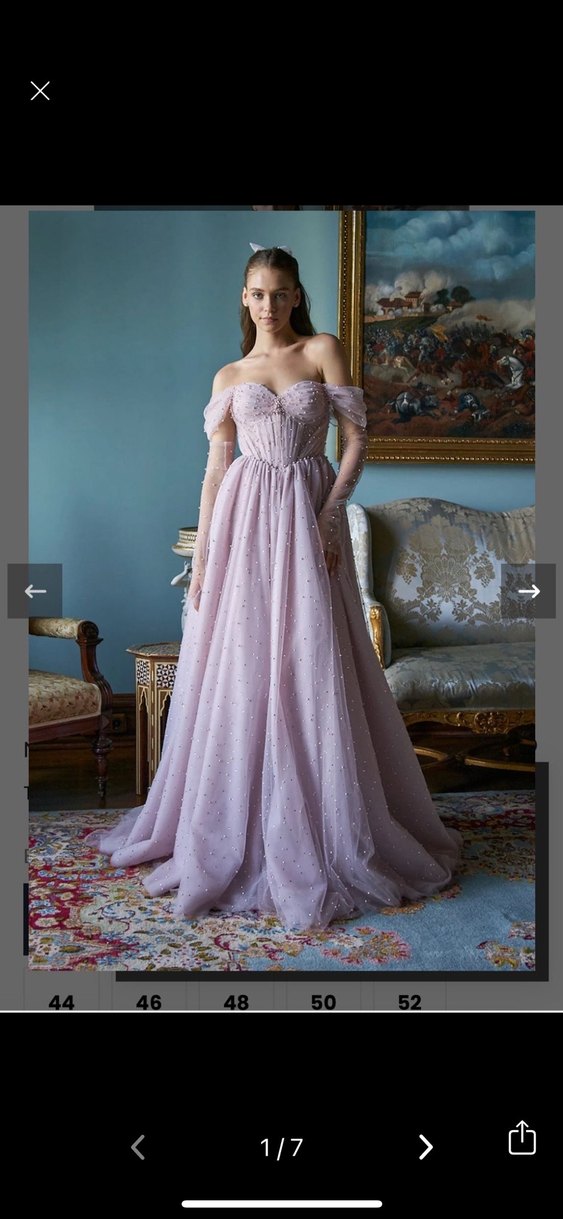 Pudra pembe, straplez yaka ve drapeli, ince askılı kollarıyla dikkat çeken uzun nişan elbisesi. İşlemeli deseni ve bol kesimiyle modern klasik tarzda şık bir seçenek.
