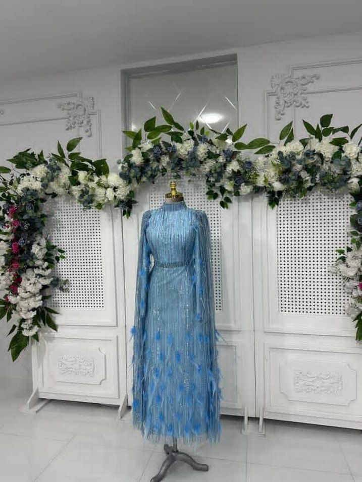 Mavi renkli, drapeli ve işlemeli uzun abiye elbise. Uzun kollu ve yüksek yakalı, düğünler için şık ve gösterişli bir seçenek. ✨