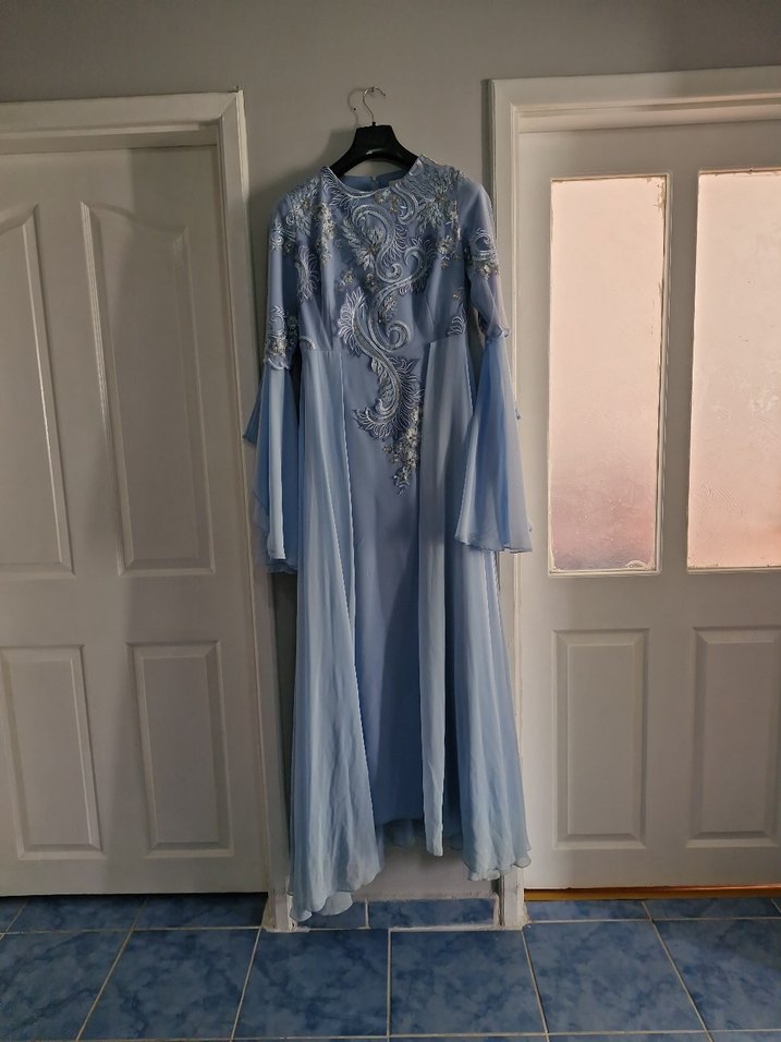 Yüksek yakalı, uzun kollu ve işlemeli detaylara sahip mavi, uzun ve bol kesim bohem elbise. Düğünler için uygun, sade ve şık bir tasarım. SIFIR