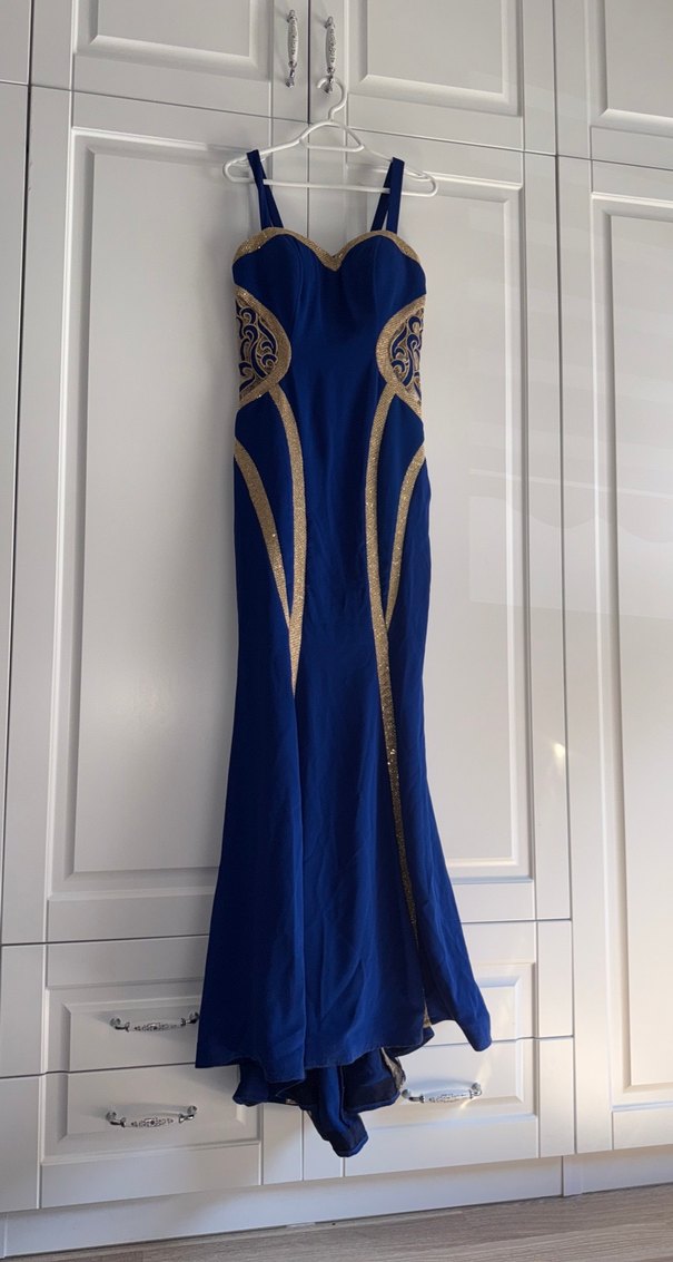 Mavi İşlemeli Uzun Drapeli Abiye Elbise balık kuyruklu