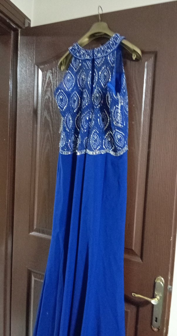 Yüksek yakalı, kolsuz mavi uzun abiye elbise, işlemeli ve drapeli detaylara sahip, düğünler için uygun. ✨ bir kez ev içinde giyildi. 42 bedende giydim ama 38 ve 40 bedende olanlarda rahat giyer. balık model
