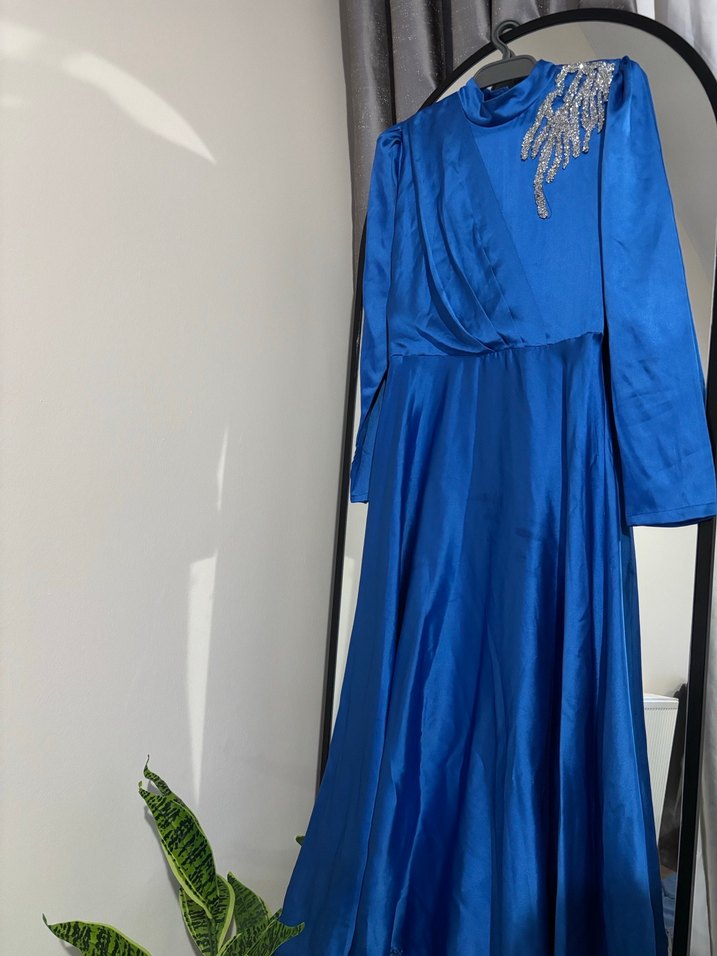 Parlak mavi renkte, yüksek yakalı ve uzun kollu, drapeli detaylı abiye elbise. İşlemeli süslemelerle klasik ve gösterişli bir görünüm sunar. Düğün için uygun.