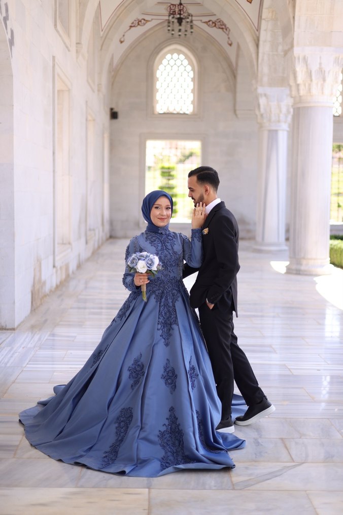Mavi İşlemeli Uzun Kollu Abiye Elbise
