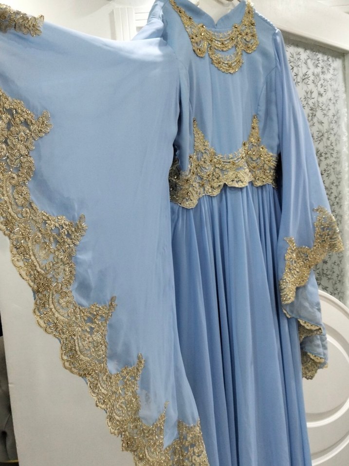 Mavi renkte, yüksek yakalı ve uzun kollu, işlemeli detaylara sahip salaş kesim abiye elbise. Dökümlü tasarımı ve parlak işlemeleriyle klasik ve bohem tarzda, düğün için uygun. boy 140 beden 38 den 46 ya kadar olur arkası ipli