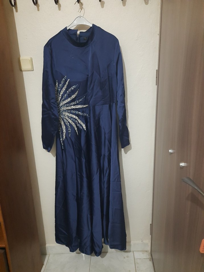 Yüksek yakalı, uzun kollu ve bol kesim mavi abiye elbise, parlak işlemeli detaylarla düğünler için uygundur.