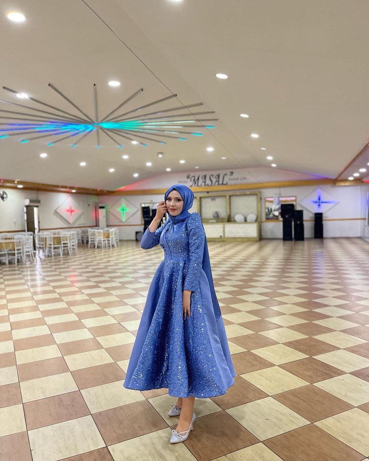 Mavi İşlemeli Uzun Kollu Tesettür Abiye