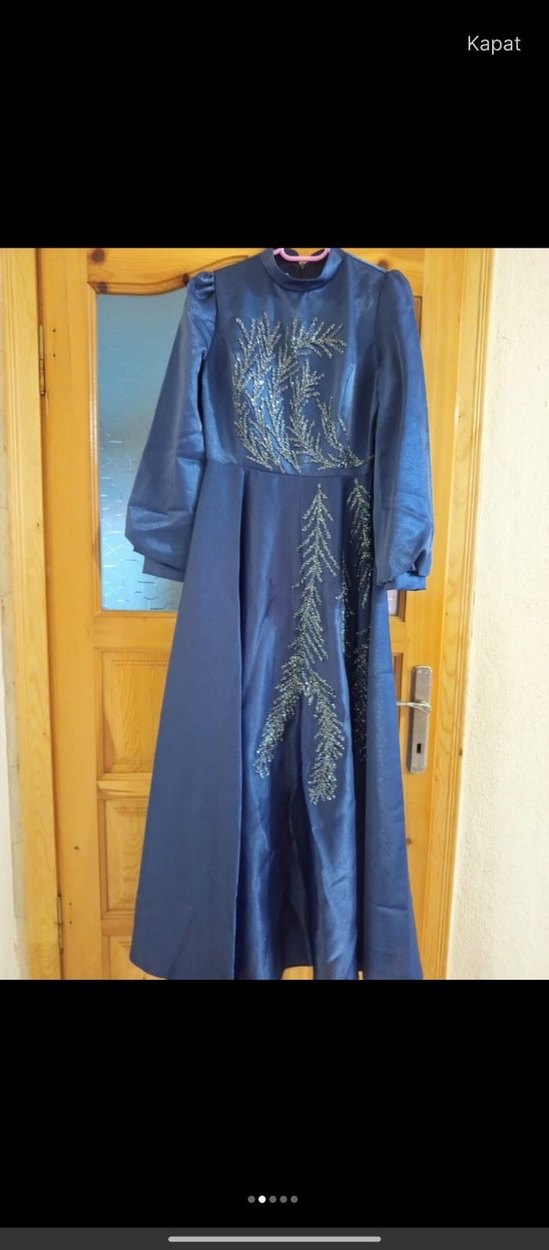 Mavi renkli, yüksek yakalı ve uzun kollu bu uzun abiye elbise, işlemeli ve drapeli detaylara sahiptir. Düzenli kesim ve parlak yüzeylidir, düğünler için uygundur. Sıfır ürün hiç kullanılmadı