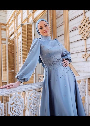 Mavi İşlemeli Uzun Kollu Uzun Abiye Elbise