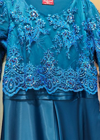 Mavi İşlemeli ve Payetli Uzun Abiye