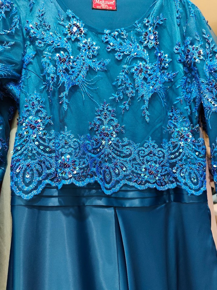 Pazarlık payı vardır.Mavi uzun abiye, V yaka ve uzun kollu olup, işlemeli ve payetli detaylarla süslenmiştir, düğünler için uygundur. ✨
