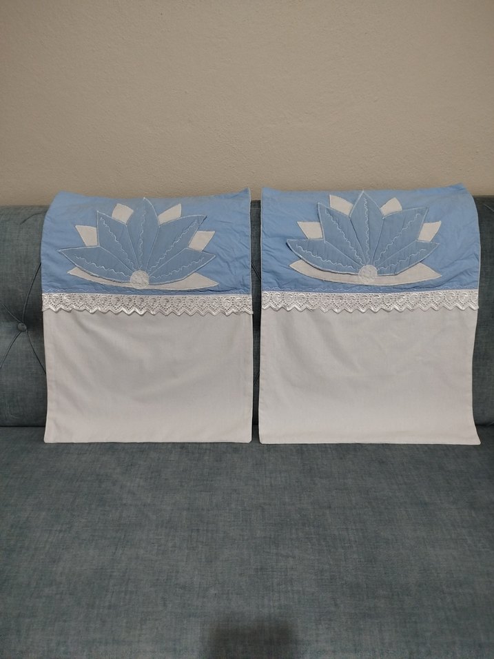 İkili yastık kılıfı mavi işlemeli resimlerde görüldüğü gibi sağlam yanlız birinin iç kısmında küçük yırtık vardı diktim son resimde belli içte kaldıgı için belli olmuyo bakarak alın#yastık#yüzü#kılıf#