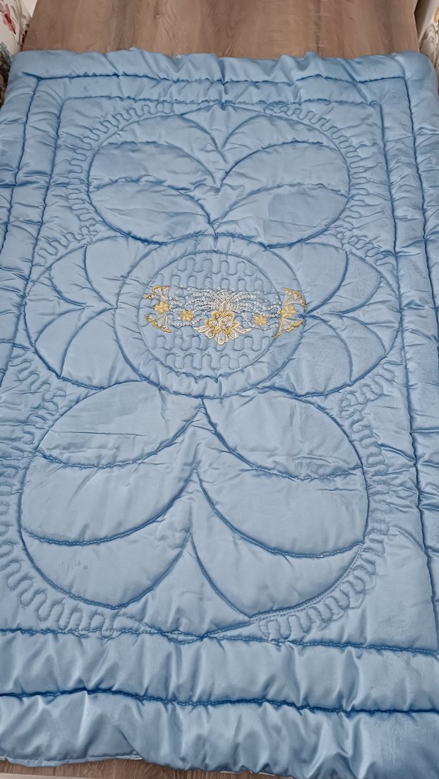 Mavi işlemeli bebek yorganı hiç kullanılmadı.