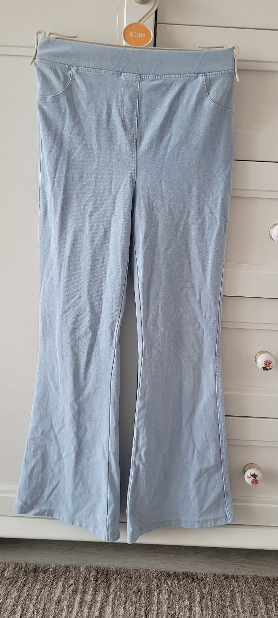 Pastel mavi renkte, ispanyol paça kot tayt pantolon. Rahat ve zahmetsiz şıklık sunar, günlük kullanıma uygundur. Sorunsuz.