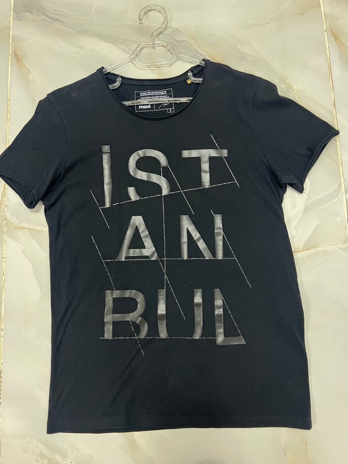 Ürün birkaç kez kullanıldı. Herhangi bir deformasyonu yoktur. Ürün ölçüleri fotoğraflarda mevcuttur. Siyah, kısa kollu, bisiklet yaka tişört sentetik kumaştan, baskılı tasarımlı, günlük kullanıma uygun.