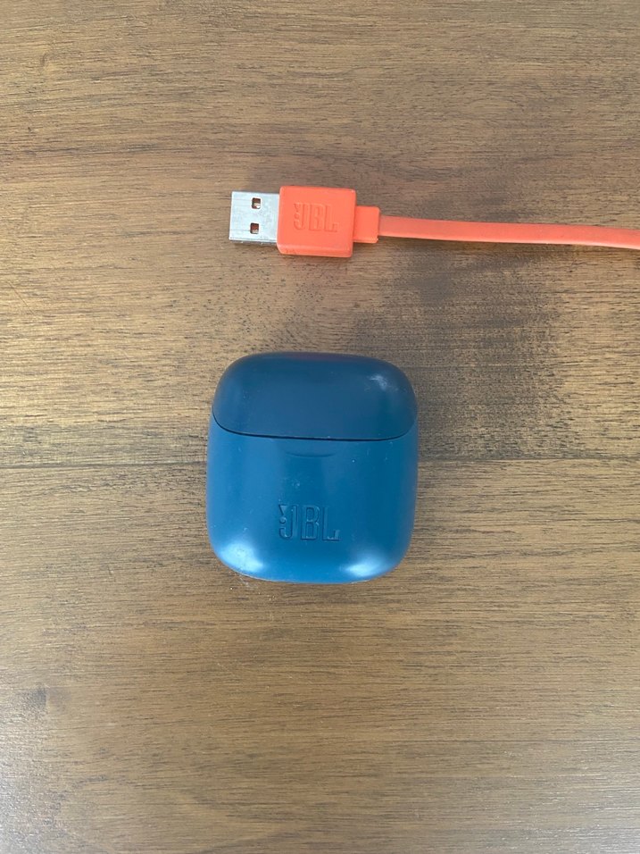 Mavi JBL kablosuz kulaklık, kompakt şarj kutusu ve turuncu USB şarj kablosu ile birlikte gelir. hiç bir problemi yok şarjı uzun süre gidiyor