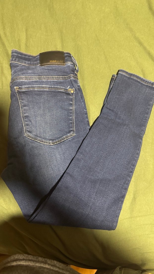 Kadınlar için mavi kot pantolon, dar kesim ve midi boyda, tokalı detaylı. Günlük rahat kullanım için uygun. 1 defa kullanıldı