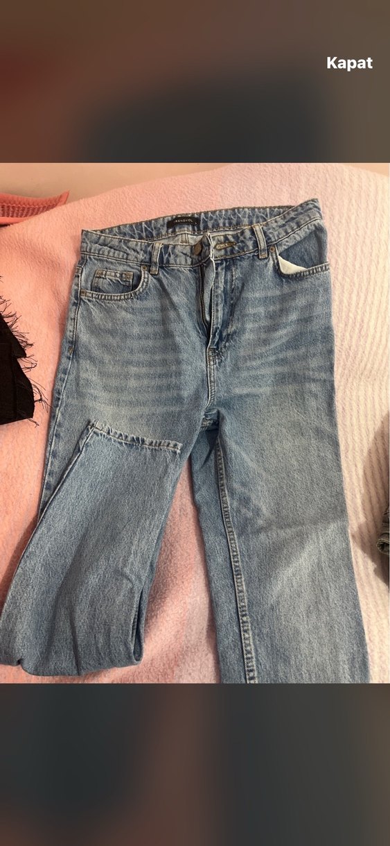 Kadın mavi denim midi boy kot pantolon, regular kesim ve tokalı detaylarla günlük sokak stili için uygundur.