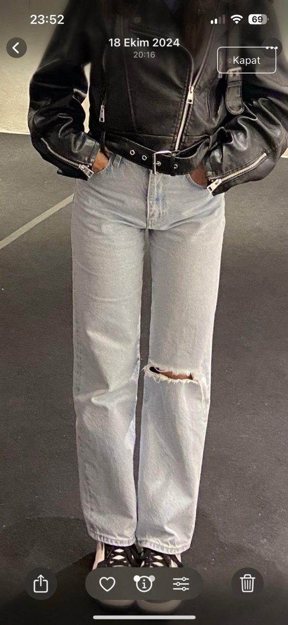 Mavi renkte, bol kesim kot pantolon. Günlük rahat sokak stiline uygun.