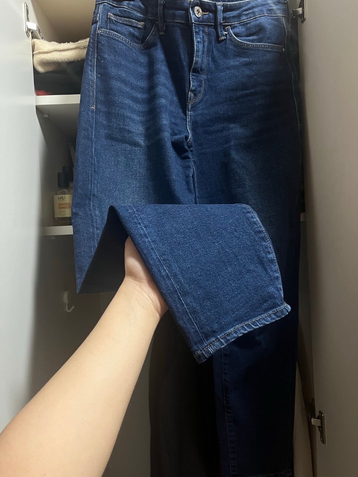 Düğmeli lacivert fitted kot pantolon, günlük rahat kullanıma uygun, desensiz ve trend normcore tarzında.