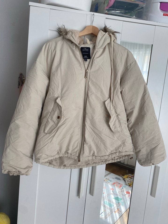 Bej renkli kadın kışlık ceket, fermuarlı, kapüşonlu ve uzun kolludur. Rahat kesim
