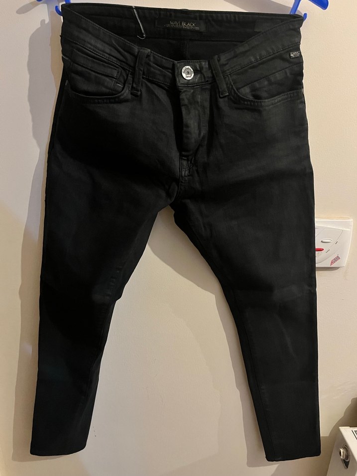 Düğmeli, siyah renkli, normal boyda ve dar kesim erkek jean. Günlük rahat sokak stiline uygun, desen içermeyen tasarım.