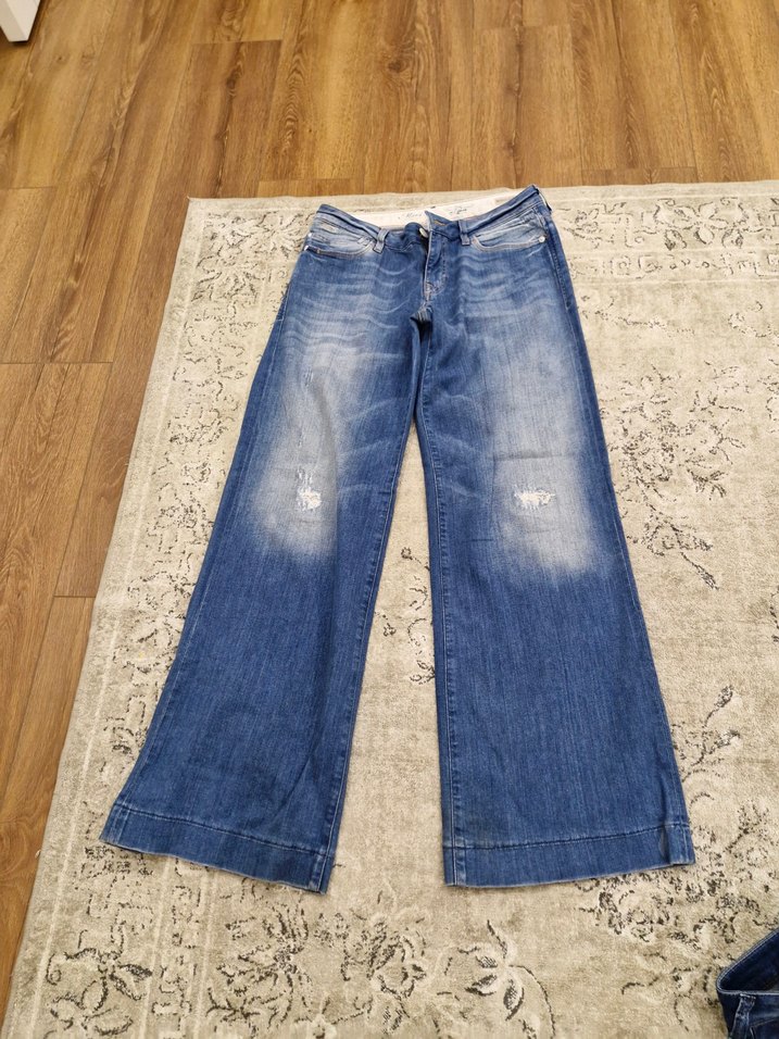 Beli kemerli, bol kesim ve normal midi boyda mavi kot pantolon. Günlük rahat kullanıma uygun, parlak görünümlü ve desensiz tarzda.