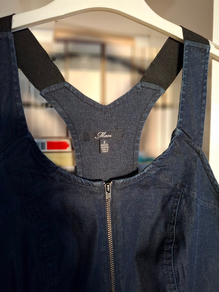 Lacivert denim kumaştan, kolsuz ve V yakalı, önden fermuarlı, gövdeyi saran midi boy elbise. Sıfır ayarında halter yaka iki kol arası 39 bel 36 basen 42 boy 87 cm likralı çok kalın kumaşlı değil rahat ve spor mavi denim elbise