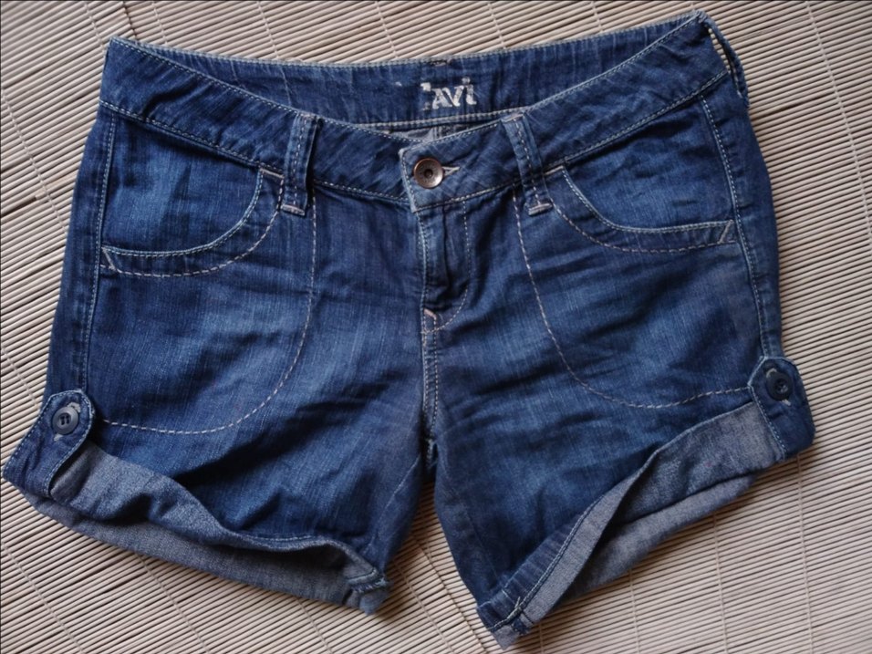 Düğmeli, parlak mavi renkli, bol kesim kadın kot şortu. Kısa mini boy ve rahat, karşı kültür tarzında günlük kullanım için uygun.