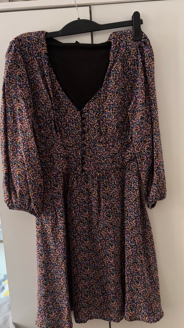 Vintage tarzda, düğmeli, V yaka ve fakir kol diz üstü elbise. Mini çiçek deseni ve yumuşak sentetik kumaş kullanılmış.vatkalı.