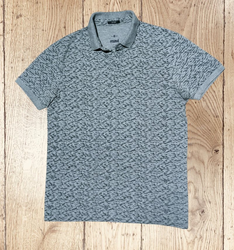 Gri renkli, kısa kollu, yakalı erkek polo tişörtü. Örme yapıda, baskılı desene sahip, rahat kesim ve günlük kullanım için uygundur.