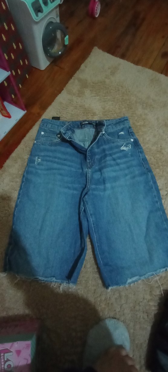 Mavii renkli, geniş kesim kot şort. günlük sokak modası tarzına sahip.