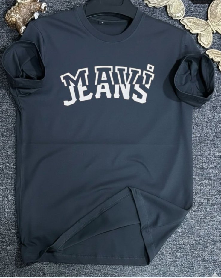 Gri renkte, kısa kollu, elastik denim kumaştan yapılmış, Mavi Jeans baskılı, bol kesim ve yuvarlak yakalı erkek tişörtü. Günlük sokak tarzı için uygundur.