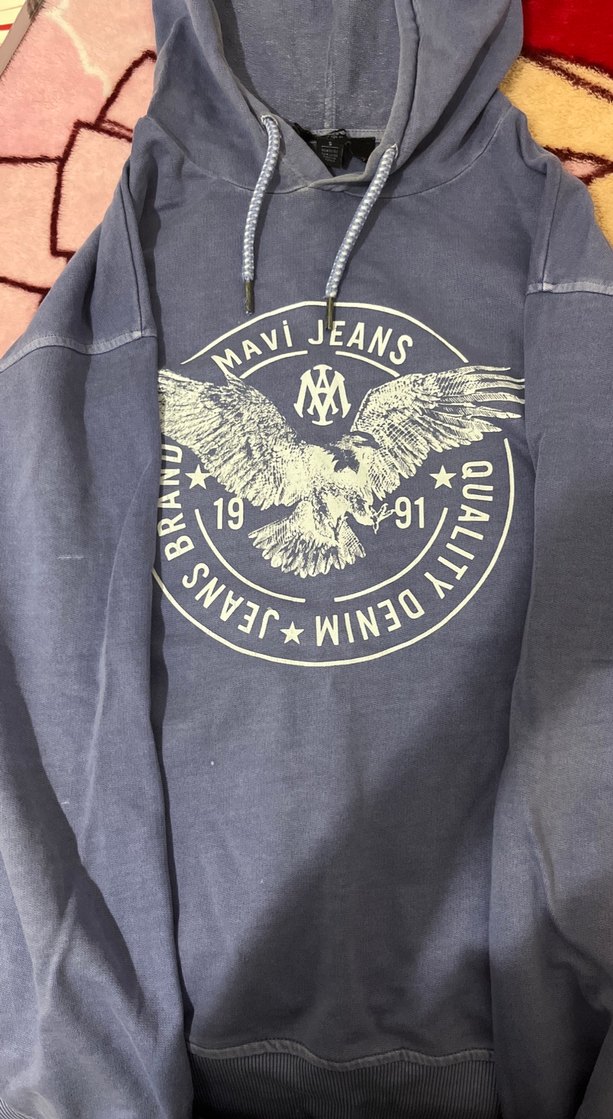 Gri denim kumaştan, uzun kollu ve bisiklet yaka, büyük baskılı kartal ve yazı desenli sweatshirt. Salaş kesim, sokak stili için uygun.