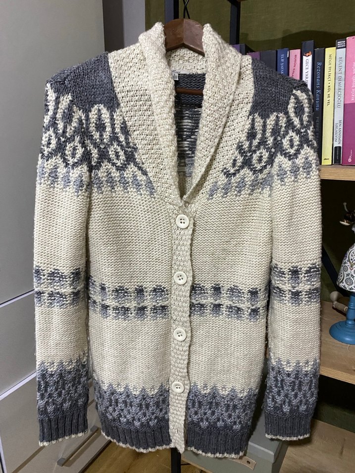 Kadınlar için gri tonlarda, notlu yaka ve uzun kollu, bol kesim bohem tarzında örgü hırka. Rahat ve günlük kullanım için uygundur.
