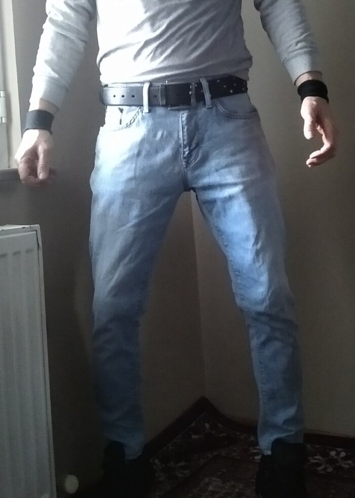 Mavi jeans marka, James model,fit kesim açık mavi renk Vintage Jean pantolon.Ürün pamuklu ve W31 L32 bedendir.(Bel:38cm. Basen:48cm. Ağ:23cm. Diz üstü:21cm. Paça:15cm. Komple boy:93cm.=>Lütfen bu ölçüleri dikkate alınız) Unisex giyime uygun,Skinny fit,dar paça,temiz , kaliteli ve şık bir üründür.Arka cebin altında belli olmayacak kadar küçük dikkat çekmeyen bir ip atması var fiyata yansıttım.Alana hayırlı olsun.