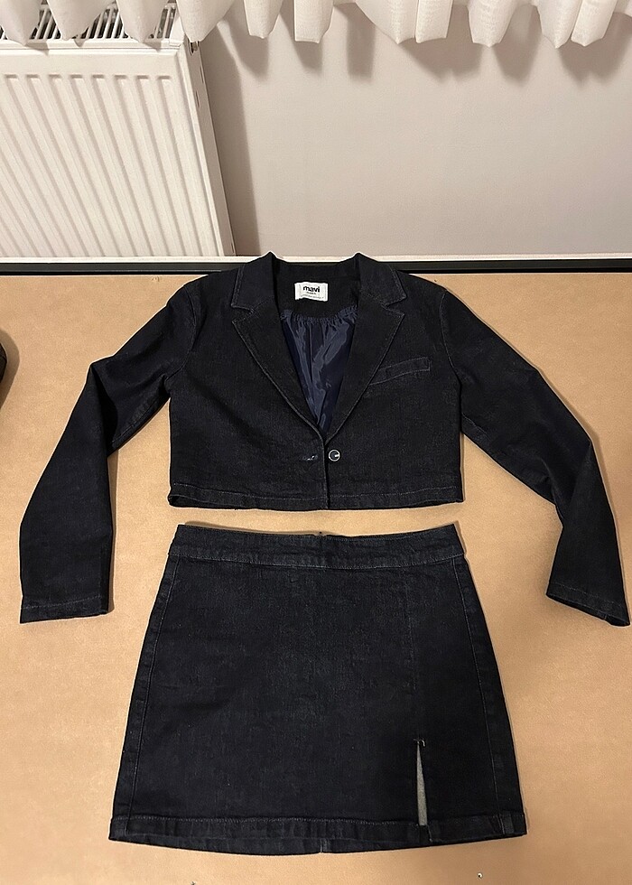 Ceket koyu kot rengi crop ve vatkalı bedeni S. Etek aynı renk mini yırtmaç fermuarlı ve M bedendir. Hiç giyilmedi çünkü online almıştım son ürünlerdi ve bedenleri bana uymadı. Etek çok rahat boyu ideal miniliktedir.