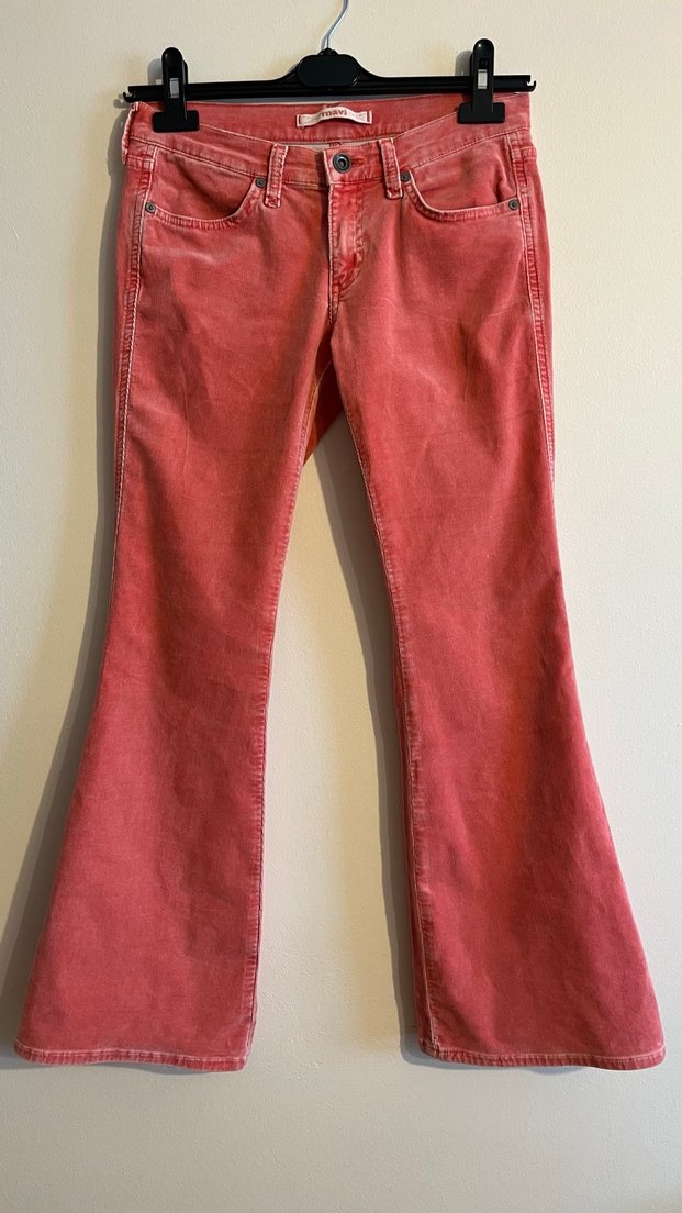 Düşük bel, hafif ispanyol paça, deformesi yok, pembeye dönük mükemmel renk Mavi Jeans kadın kadife pantolon
