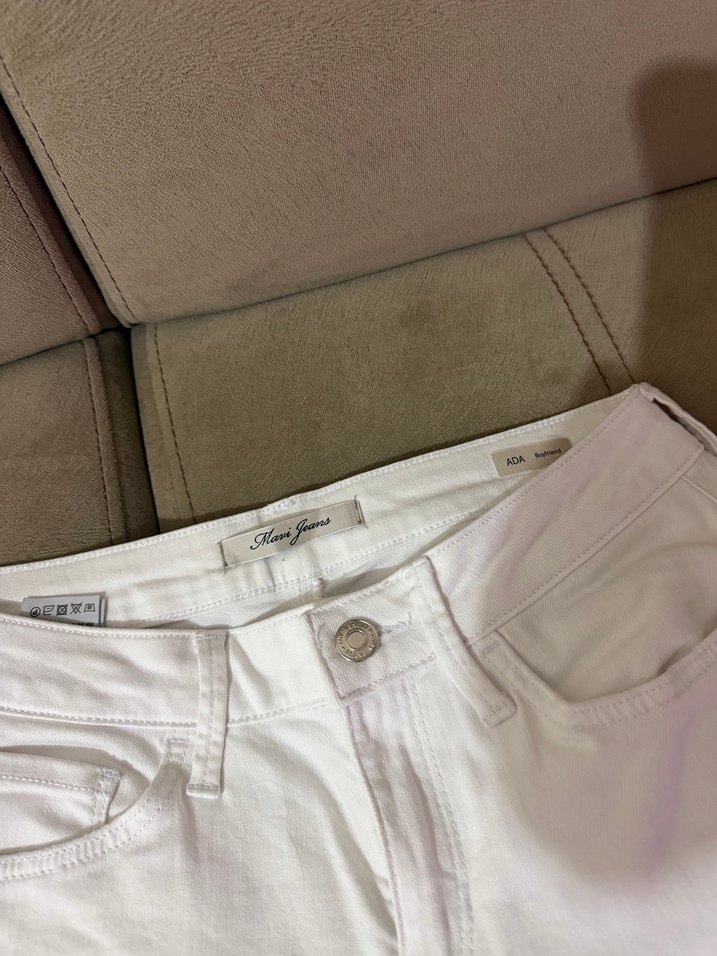 Mavi Jeans marka ada modeli normal bel düğmeli beyaz kot pantolon, normal kesim ve midi boyda. Günlük rahat sokak stiline uygun, hafif kendinden desenli tasarım.İade yoktur.