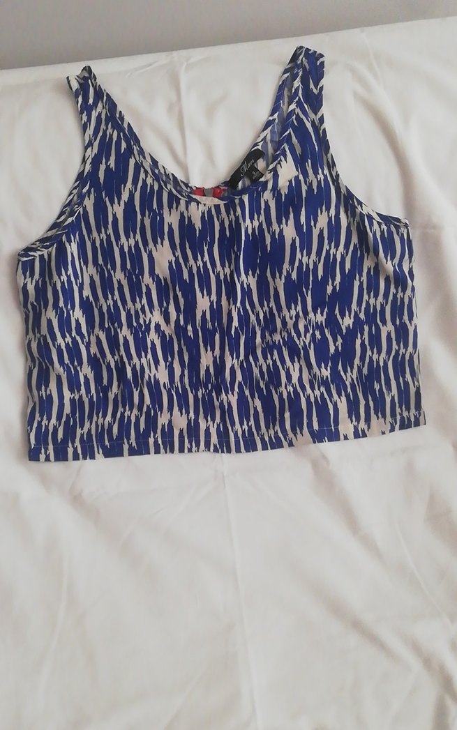 Kolsuz, tekne yaka ve piliseli tasarıma sahip mavi bağlamalı desenli bluz. Bol kesim ve kısa boy, günlük sokak stili için uygundur.