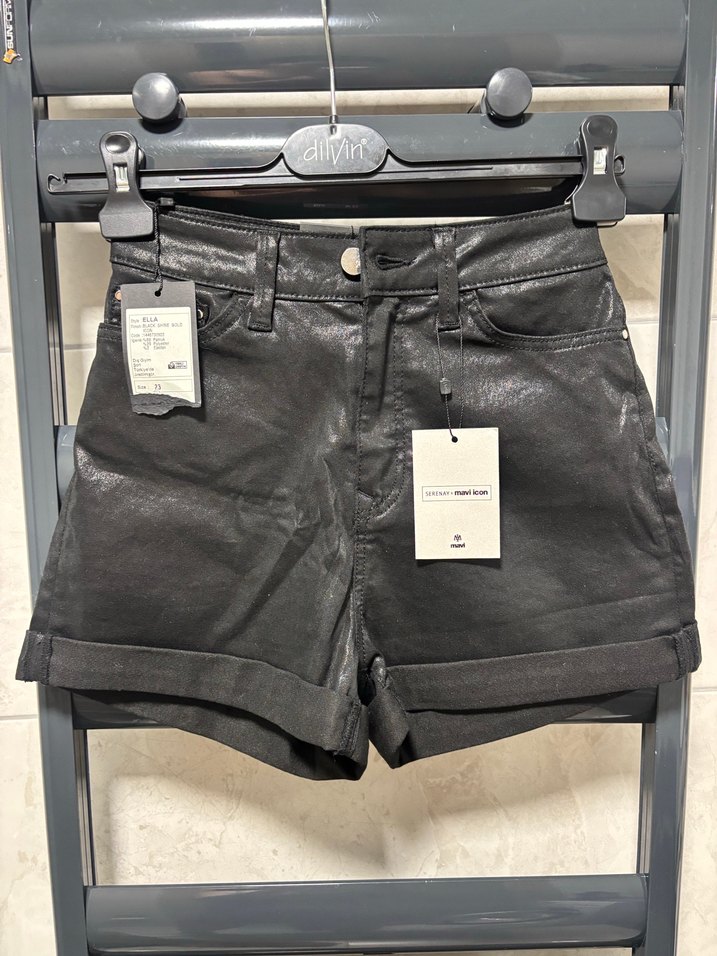 Kemerli ve dar kesim siyah deri mini şort, günlük kullanıma uygun sokak stili için ideal. Baskılı detaylar şıklık katıyor.