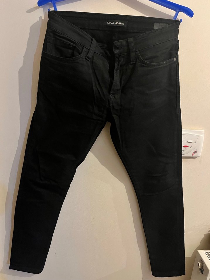Düğmeli, siyah, dar kesim erkek kot pantolon. Normal midi boyda, desen içermeyen, günlük rahat kullanıma uygun sokak stili pantolon. 28 beden