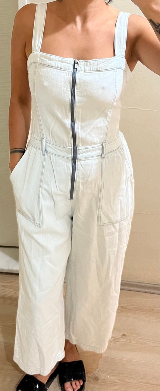 Açık buz mavisi denim kumaştan, fitted kesim midi tulum. Ön fermuar ve ceplerle sade ve şık görünüme sahip. Bir iki kez giyildi.