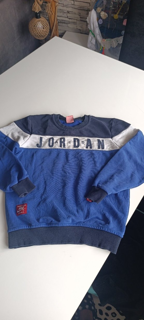 Uzun kollu, bisiklet yaka, bol kesim mavi Jordan denim erkek sweatshirt. Örme kumaştan, günlük kullanıma uygun rahat bir tasarım.