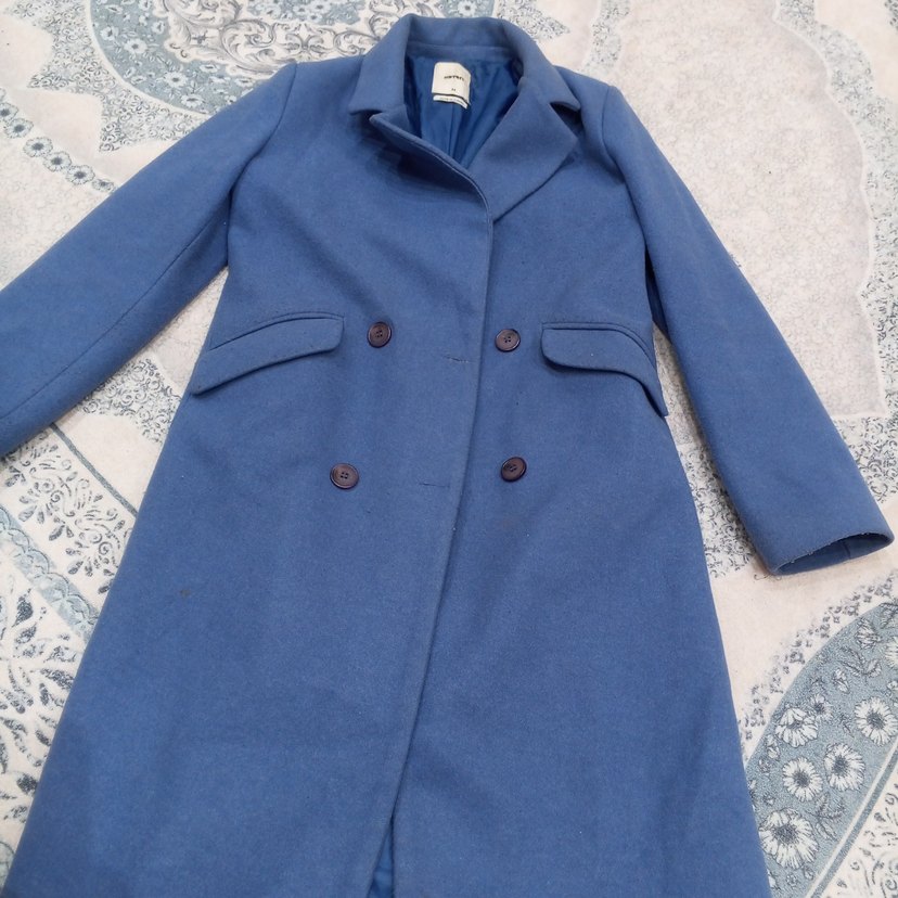 Mavi renkte, çift düğmeli kapama ve kapaklı ceplere sahip klasik kesim kaban. Uzun kollu ve yakalı tasarım.