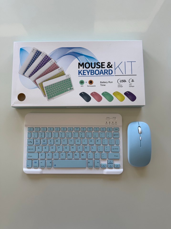 Açık mavi renkte kablosuz klavye ve mouse seti, 150 saate kadar pil ömrü sunar. Şarj edilebilir klavye ve kompakt mouse ile rahat kullanım sağlar.