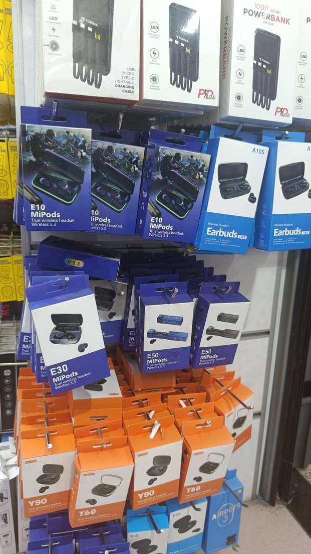 Koyu mavi renkli kablosuz kulaklıklar ve MiPods şarj kutusuyla birlikte sergileniyor. E10, E30 ve E50 gibi çeşitli modeller mevcut.