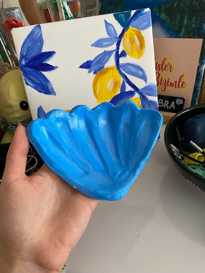 Düzgün yüzeyli, mavi kabuk şeklinde dekoratif tabak, herhangi bir mekâna renk katmak için uygun. el emeği kendim yaptım