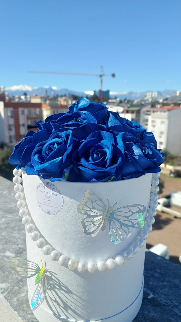 Canlı mavi güller ve inci görünümlü boncuk zinciri ile süslenmiş kutu. Kelebek çıkartmaları ile tamamlanmıştır.