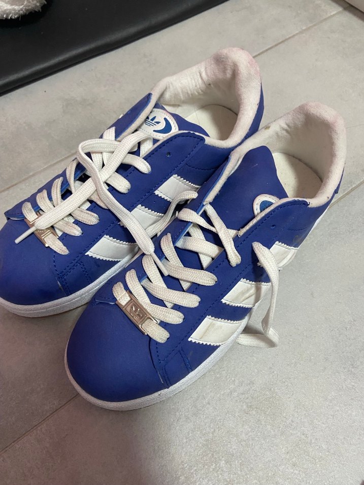 Mavi ve beyaz renkli, lastik malzemeden yapılmış, velcro ve bağcıklı kadın spor ayakkabısı. Düz tabanlı ve günlük kullanıma uygun. A kalite